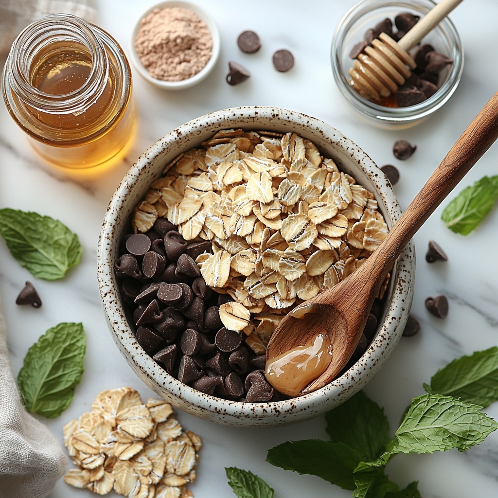Begin by combining the rolled oats, almond butter, honey, vanilla protein powder, and peppermint extract in a large bowl. Stir everything together until you get a dough-like consistency. This mix forms the flavorful, wholesome base that holds all the deliciousness together, making every bite satisfyingly dense yet tender.