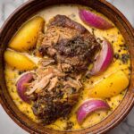 This Apple Cider Braised Pork Shoulder recipe features tender, slow-cooked pork infused with the sweet and tangy flavors of fresh apple cider, aromatic herbs, and savory broth. The pork is seared to develop a rich crust, then braised low and slow in a flavorful liquid until meltingly tender. Finished with baked apples and onions, this hearty and comforting dish is perfect for fall or any cozy occasion.