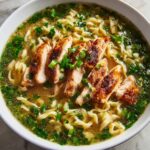 This Aromatic Ginger Scallion Chicken Noodle Soup is a comforting and flavorful meal featuring tender chicken breasts simmered in a fragrant broth of fresh ginger, garlic, scallions, and soy sauce. Combined with your choice of noodles and finished with a touch of sesame oil, it’s a perfect dish for a cozy lunch or dinner that’s quick to prepare and full of nourishing goodness.