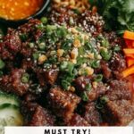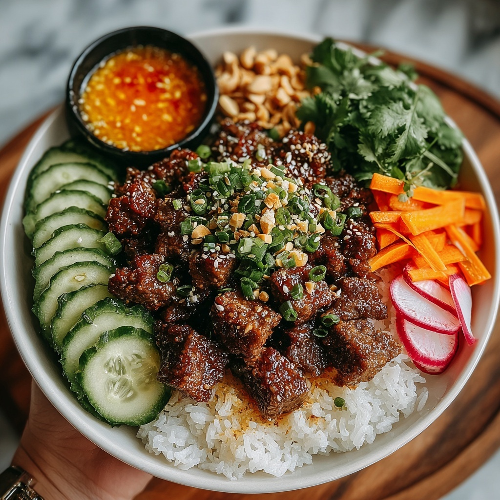 Divide your perfectly cooked jasmine rice into serving bowls. Layer on the caramelized protein, then pile on pickled carrots and daikon, fresh cucumber slices, red bell pepper, and chopped cilantro. Each layer adds essential freshness, tang, and texture, making every bite rich and balanced.