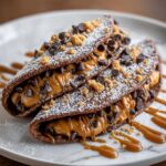 Fill each cooled brownie shell generously with the peanut butter mixture. Don’t be shy—the beauty of this recipe is indulgence! Once filled, sprinkle the tops with crushed peanuts and mini chocolate chips, then crown each taco with a generous drizzle of caramel sauce to add that extra burst of sweetness and visual appeal.