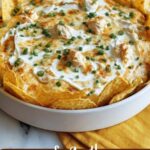 Serve it warm in its baking dish or a heated serving bowl, surrounded by a variety of dippers like chips, crackers, and fresh veggies. Keeping it warm helps maintain that ooey-gooey texture that guests will love.