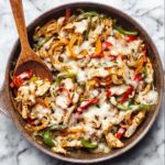 Once the chicken is cooked through and beautifully browned, return the sautéed peppers and onions to the skillet, pouring in any flavorful juices left on the plate. Stir everything together so that the flavors meld perfectly. Then, sprinkle the shredded provolone cheese generously over the top—a final touch that transforms this from skillet to sensational comfort food.