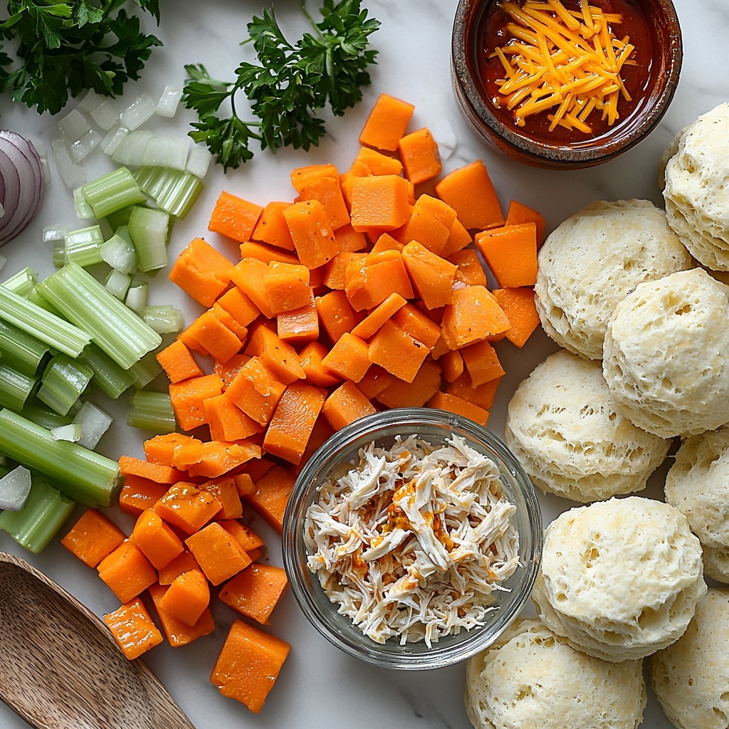 Gathering the right ingredients is key to nailing this recipe’s harmonious blend of spice, creaminess, and texture. Each component, from the fresh veggies to the cheesy biscuit topping, plays an essential role in creating the perfect balance of flavors and colors.