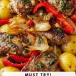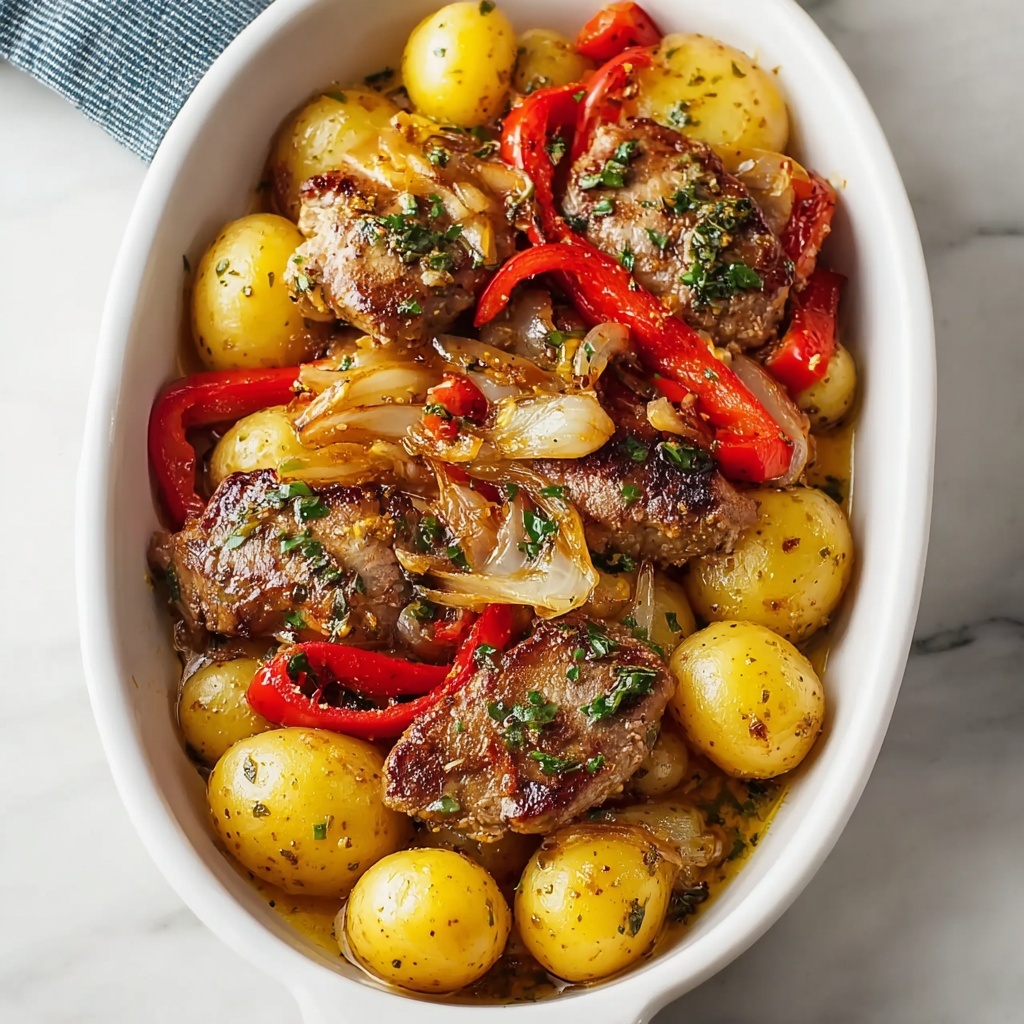 Chicken Scarpariello with Potatoes and Cherry Peppers is a flavorful Italian-American dish featuring juicy bone-in chicken thighs and spicy Italian sausage cooked with tangy pickled cherry peppers, roasted baby potatoes, and a savory sauce made with white wine, garlic, and herbs. This one-pan oven-roasted meal delivers a perfect balance of crispy textures and bold, vibrant flavors ideal for a comforting family dinner.