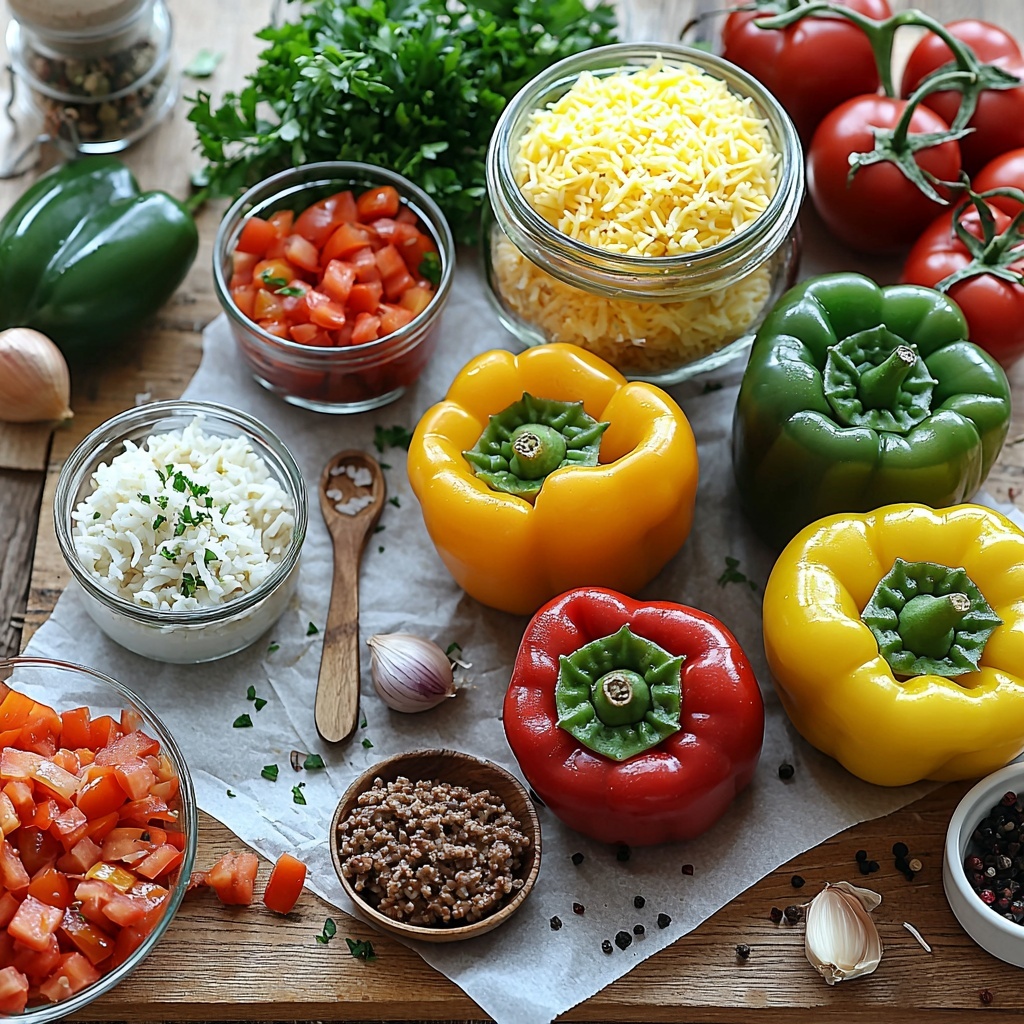 Keeping the ingredient list straightforward yet full of flavor is what makes this Classic Stuffed Bell Peppers Recipe so approachable. Each component plays a vital role, from the fresh bell peppers that provide a sweet crunch to the seasoned beef and rice filling that makes it hearty and satisfying.