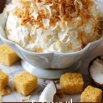 Spoon the creamy dip into a serving bowl, spreading it evenly. Then sprinkle the toasted coconut on top to create a visually appealing, textured finish. This final touch brings everything together and ensures each bite has that signature coconut crunch.