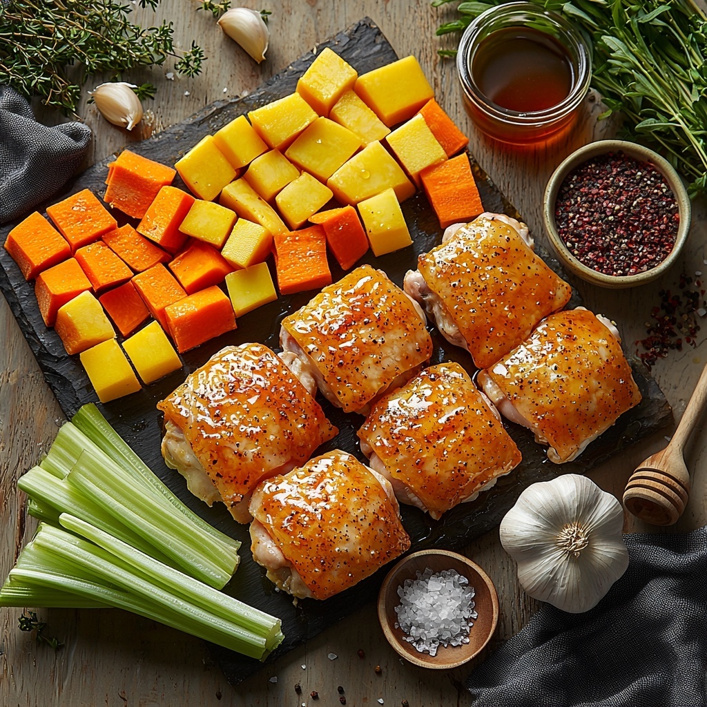 Crispy Roasted Chicken Thighs with Veggies is a flavorful and hearty meal featuring bone-in, skin-on chicken thighs marinated in a savory soy-ginger garlic sauce, then roasted alongside a medley of Yukon gold potatoes, sweet potatoes, carrots, celery, and shallots. This one-pan dish delivers crispy skin, tender juicy meat, and perfectly caramelized vegetables in about an hour and fifteen minutes, making it a perfect comforting dinner.