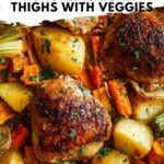 For a cozy dinner party, plate each chicken thigh on a bed of roasted veggies, drizzle with some of those roasting juices, and garnish with fresh herbs for a rustic, inviting look. Alternatively, stack the veggies and chicken in a beautiful serving dish for a charming family-style meal that invites everyone to dig in.