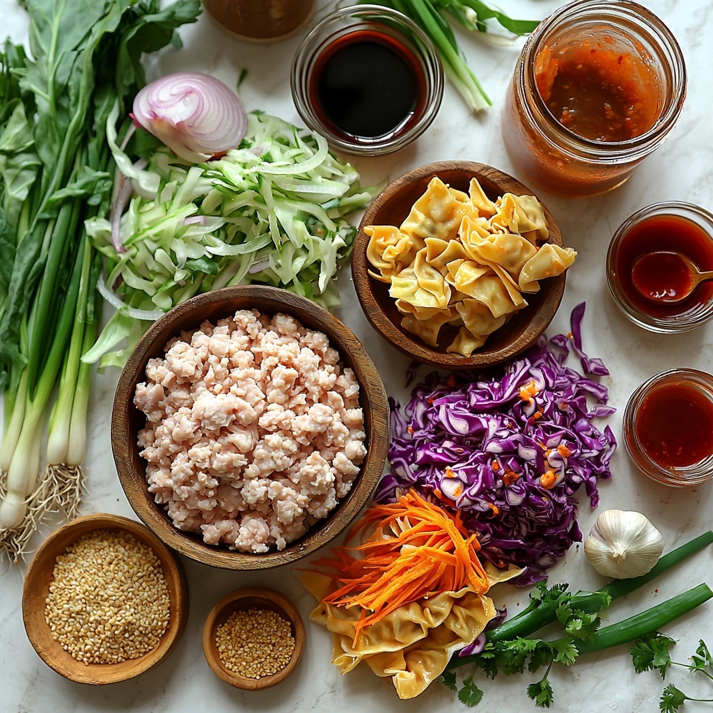 • Green onion, wonton strips, and sweet chili sauce (for garnish): these finishing touches add crunch, freshness, and a little sweet-spicy zing.