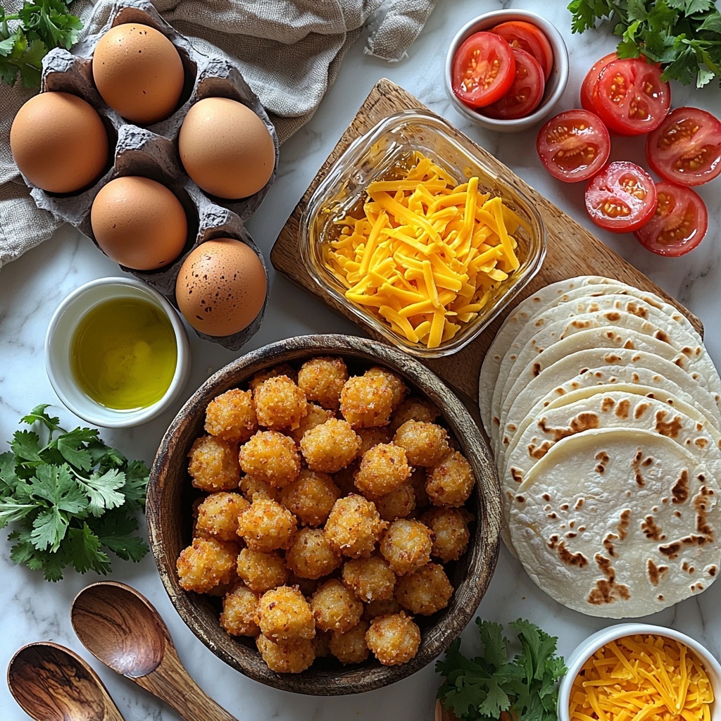 These ingredients are straightforward and easy to find, yet each one plays an essential role in crafting the perfect balance of textures and flavors in your breakfast burritos. From the crispy contrast of tater tots to the creamy richness of eggs and cheese, this lineup guarantees satisfaction in every bite.