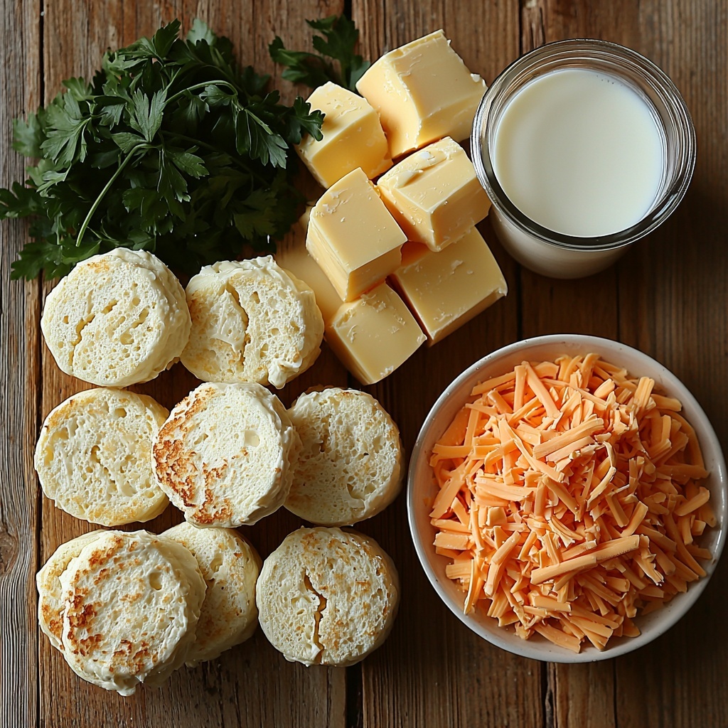 - English muffins: Quartered for soft, buttery layers that soak up the egg mixture perfectly without turning mushy.