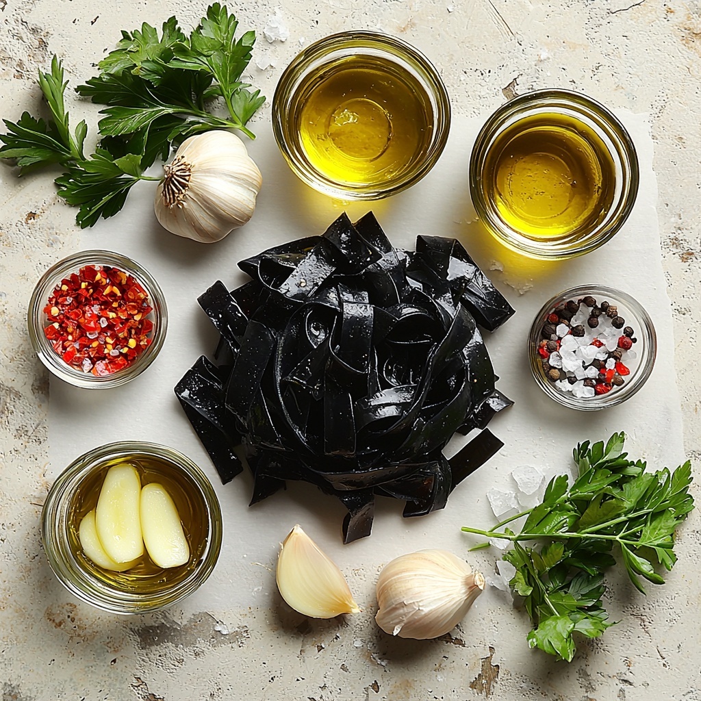 A rich and flavorful Garlic Black Pasta Aglio e Olio recipe that brings together the boldness of squid ink pasta with the classic Italian flavors of garlic, olive oil, and chili flakes. This quick and easy dish is perfect for a weeknight dinner, offering a striking black pasta visually enhanced with fresh parsley and a slight kick of heat.