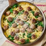 A quick and flavorful Garlic Olive Oil Pasta with savory Italian-style beef and pork meatballs, fresh spinach, and a generous sprinkle of parmesan cheese. This easy one-pan meal combines tender pasta with garlicky olive oil, succulent meatballs, and fresh greens for a satisfying dinner in under 25 minutes.