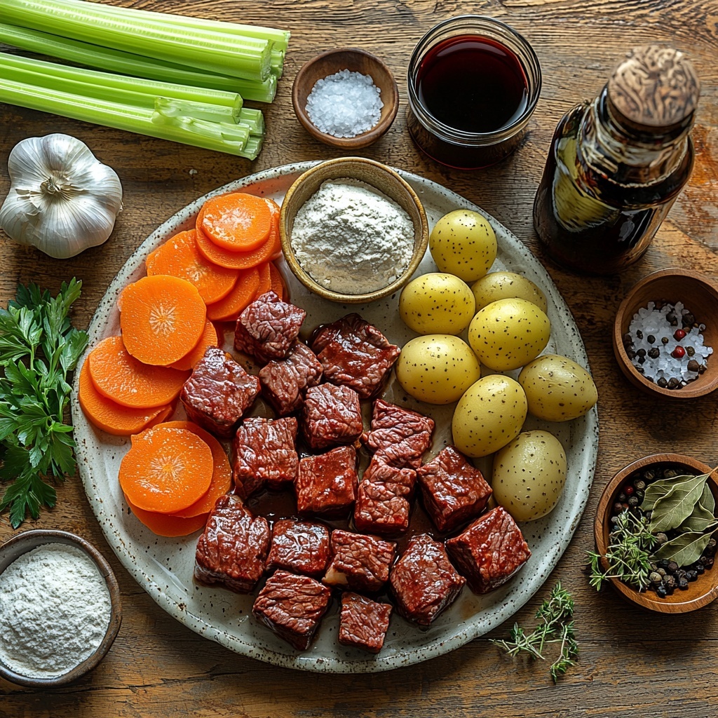 The magic of this Hearty Slow-Simmered Savory Beef Stew Recipe starts with a handful of simple, wholesome ingredients that each play a crucial role in building its comforting flavor profile. From the choice of beef to the fresh vegetables and herbs, every item is essential for creating that hearty, satisfying texture and warmth.