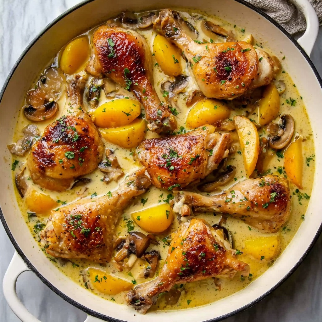 Stir in the halved baby yellow potatoes, making sure they’re well coated with the flavorful sauce. Nestle your seared chicken pieces right on top, then transfer the Dutch oven to a preheated oven set at 375°F (190°C). Roast uncovered for 40 to 45 minutes until the chicken reaches an internal temperature of 165°F (74°C) and the potatoes are tender and soaking in those aromatic juices.
