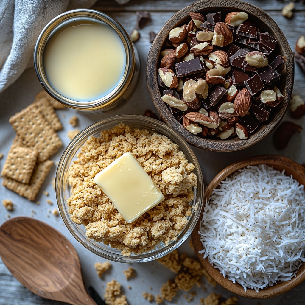 In a bowl, mix together the graham cracker crumbs and melted butter until combined. This buttery, crumbly mixture is your crunchy yet tender base that holds all the magic layers on top. Press it firmly and evenly into the bottom of your prepared dish – this is where your bars start coming to life!
