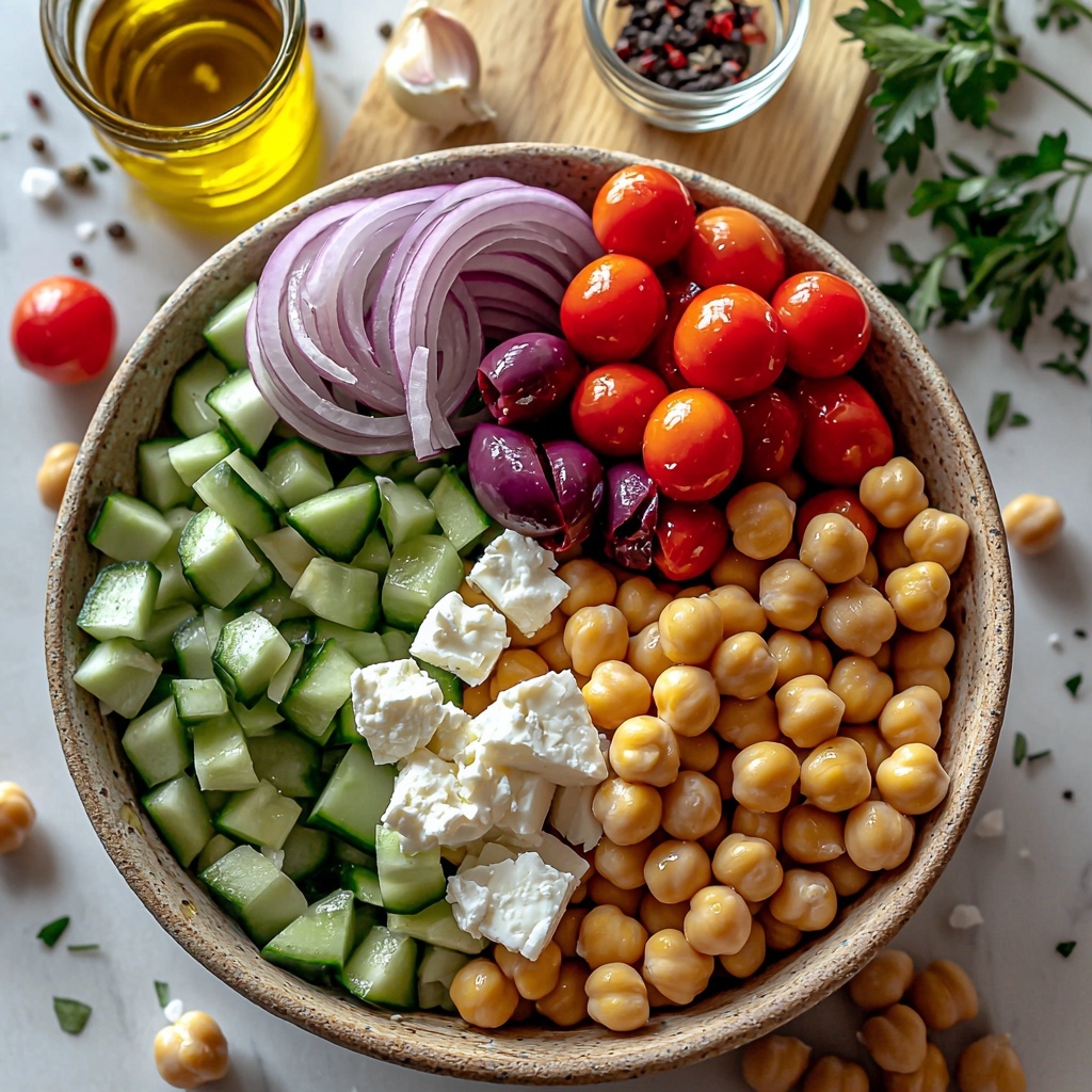 Start by gathering your chickpeas, cherry tomatoes, cucumber, red onion, kalamata olives, crumbled feta, and fresh parsley in a large bowl. This vibrant mix is the heart of your salad, bursting with contrast from juicy tomatoes to creamy feta and crisp cucumber. Tossing them together at this stage ensures every bite will be a delicious blend of texture and flavor.