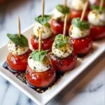 Mini Caprese Mozzarella Bites are delightful, bite-sized appetizers featuring juicy cherry tomatoes, fresh mozzarella pearls, and fragrant basil leaves, all drizzled with a sweet and tangy homemade balsamic glaze. Perfect for parties or light snacks, these easy-to-make skewered bites offer a refreshing and flavorful taste of classic Italian Caprese salad in a convenient finger-food format.