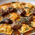 Serve the One-Skillet Garlic Butter Steak & Cheese Ravioli Recipe straight from the pan for a cozy, rustic vibe that feels like home-cooked comfort food. For a dinner party, plate it elegantly on white dishes, drizzle with extra butter sauce, and garnish with herbs and a lemon wedge to brighten the presentation.