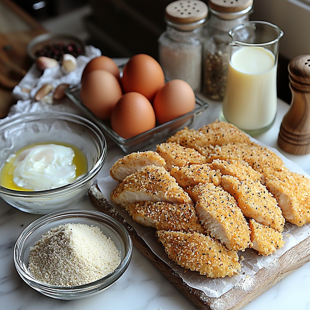 Set up a breading station with three shallow bowls: one filled with flour, one with beaten eggs, and one with a mixture of Parmesan cheese, Panko breadcrumbs, garlic powder, Italian seasoning, and black pepper. Dredge each chicken breast first in flour, then dip into the eggs, and finally coat generously with the cheesy breadcrumb mixture. This triple-layer method locks in moisture while delivering that ultra-crispy crust.