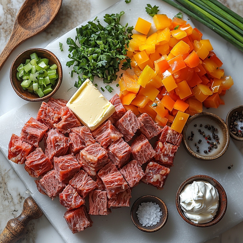 Gathering simple, yet essential ingredients is the first step to creating a flavor-packed Philly Cheesesteak Dip Recipe. Each item contributes something special — from the savory depth of roast beef to the creamy smoothness of cheese — making the dip irresistible in every bite.