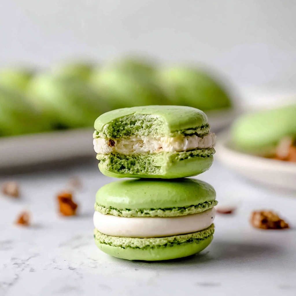 Delicate and vibrant Pistachio Macarons featuring a crisp almond-pistachio shell and a rich, creamy pistachio buttercream filling. These French-style macarons are perfect for elegant dessert occasions and showcase the nutty flavor of pistachios with a subtle almond essence, balanced with a smooth, sweet buttercream.