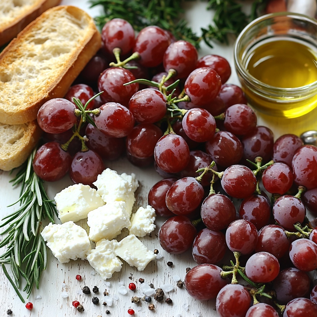 - Prepare Grapes: In a baking dish, toss the red grapes with olive oil, chopped fresh rosemary, salt, and black pepper until evenly coated to infuse the grapes with flavor.