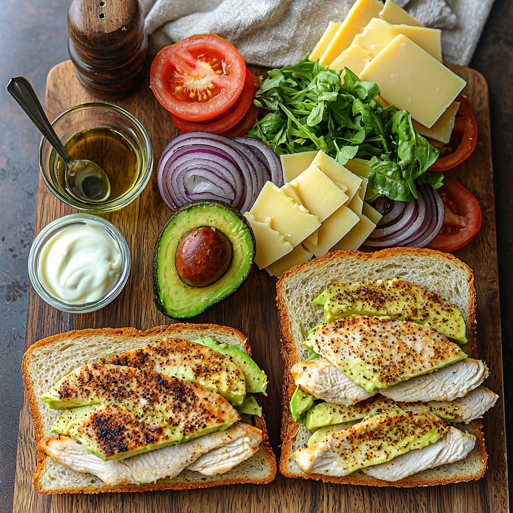 - Assemble Sandwiches: Spread mayonnaise and Dijon mustard evenly on each slice of bread. Layer the sliced chicken, avocado, cheese, red onion, and tomato on two slices, then top with the remaining bread slices.