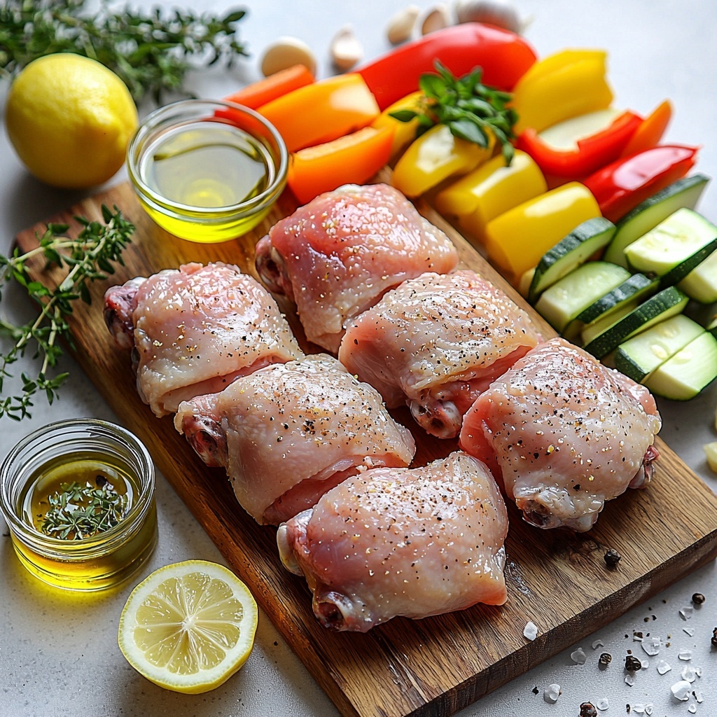 Line a baking sheet with parchment paper to prevent sticking and make cleanup a breeze. Place the marinated chicken thighs in the center, then surround them with your colorful assortment of mixed vegetables like bell peppers and zucchini. This not only makes for an eye-catching presentation but ensures the veggies soak up some of those delicious juices as they roast.