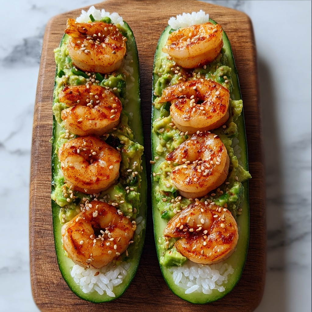 Delight in these refreshing Shrimp Avocado Cucumber Boats, a light and flavorful appetizer combining succulent seasoned shrimp, creamy mashed avocado, and sushi rice nestled in crisp cucumber quarters. Finished with a drizzle of spicy mayo and a sprinkle of sesame seeds, this dish is perfect for a healthy snack or elegant party bite.