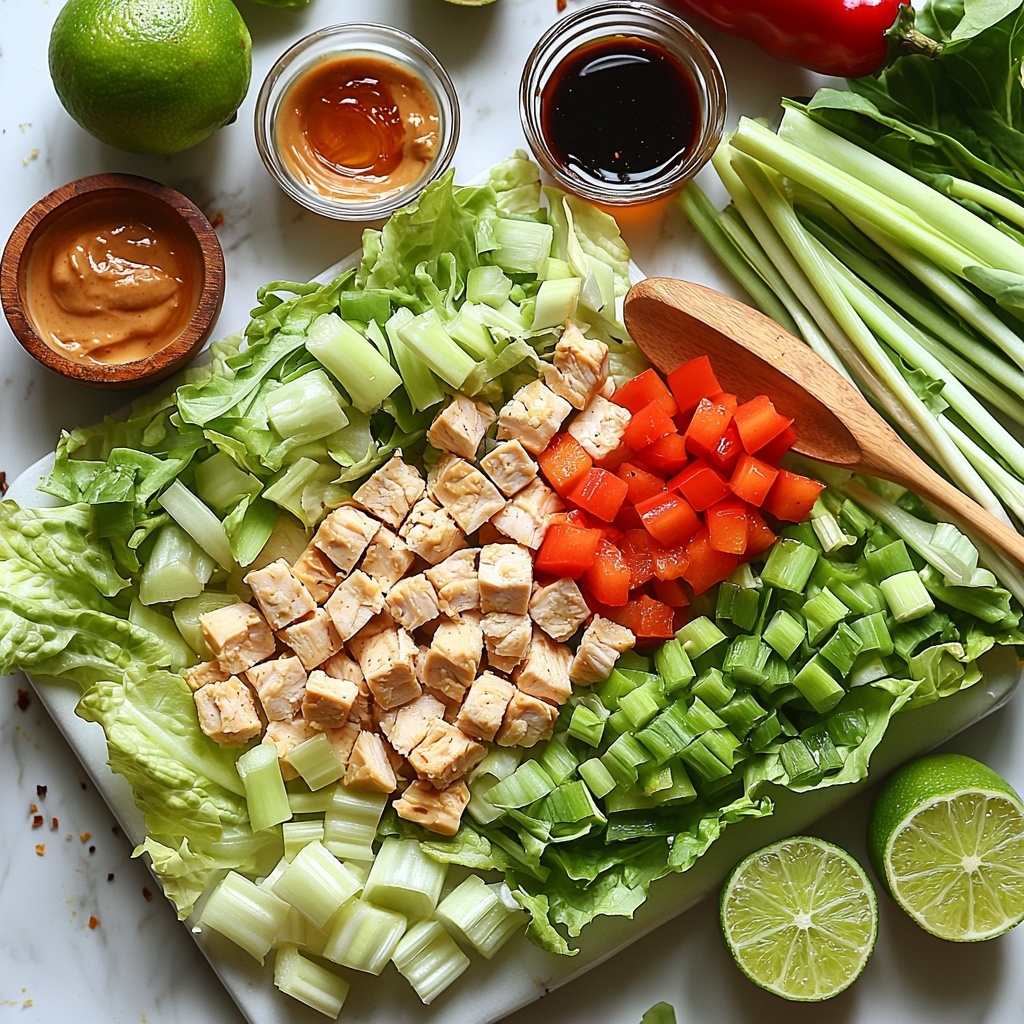 Lay out your large romaine lettuce leaves — these will serve as your edible “boats.” Spoon the savory chicken mixture into each leaf generously, then drizzle with extra peanut sauce if you want to dial up that irresistible flavor. Each bite bursts with freshness, creaminess, and a little zing from the lime.