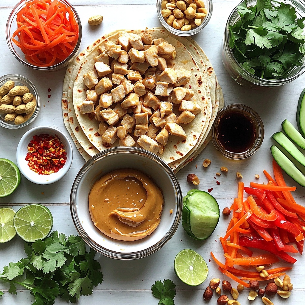 Reheat the cooked chicken and peanut sauce gently in a skillet or microwave until warm. Be careful not to overheat to avoid drying out the chicken. Then, assemble the wraps fresh with the vegetables and tortilla before serving to keep everything crisp and vibrant.