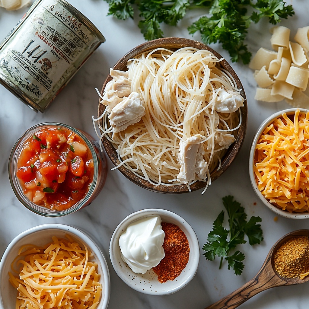 The ingredients for The Best Chicken Spaghetti Recipe are simple yet carefully chosen to create a harmony of creaminess, spice, and cheesy goodness. Each one adds something essential—whether it’s the tender texture of the chicken, the saucy richness of the cream soup, or the melty, flavorful Mexican cheese blend that brings it all together.